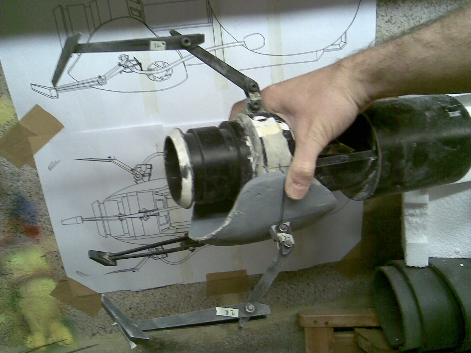 Next on the list was the inside of the nozzle. There is a smaller set of rings with lots of fins coming off it, like a turbine blade. With nothing to hand that even resembled it I had to make it from scratch. A ring of bin lid plastic and a short section of pipe formed the central section.